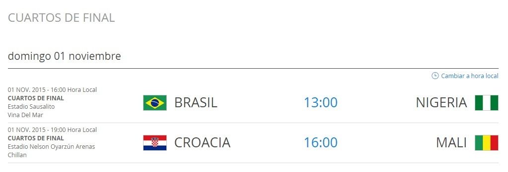 El primer encuentro lo disputarán Brasil contra Nigeria, un duelo de históricas potencias juveniles. Los sudamericanos vencieron por la mínima a Nueva Zelanda, toda una revelación en el torneo, mientras que el conjunto africano goleó Se verán las caras el próximo 1 de noviembre a las 16:00 h (hora local, 13:00 h en México) en el Estadio El Sausalito de Viña del Mar.