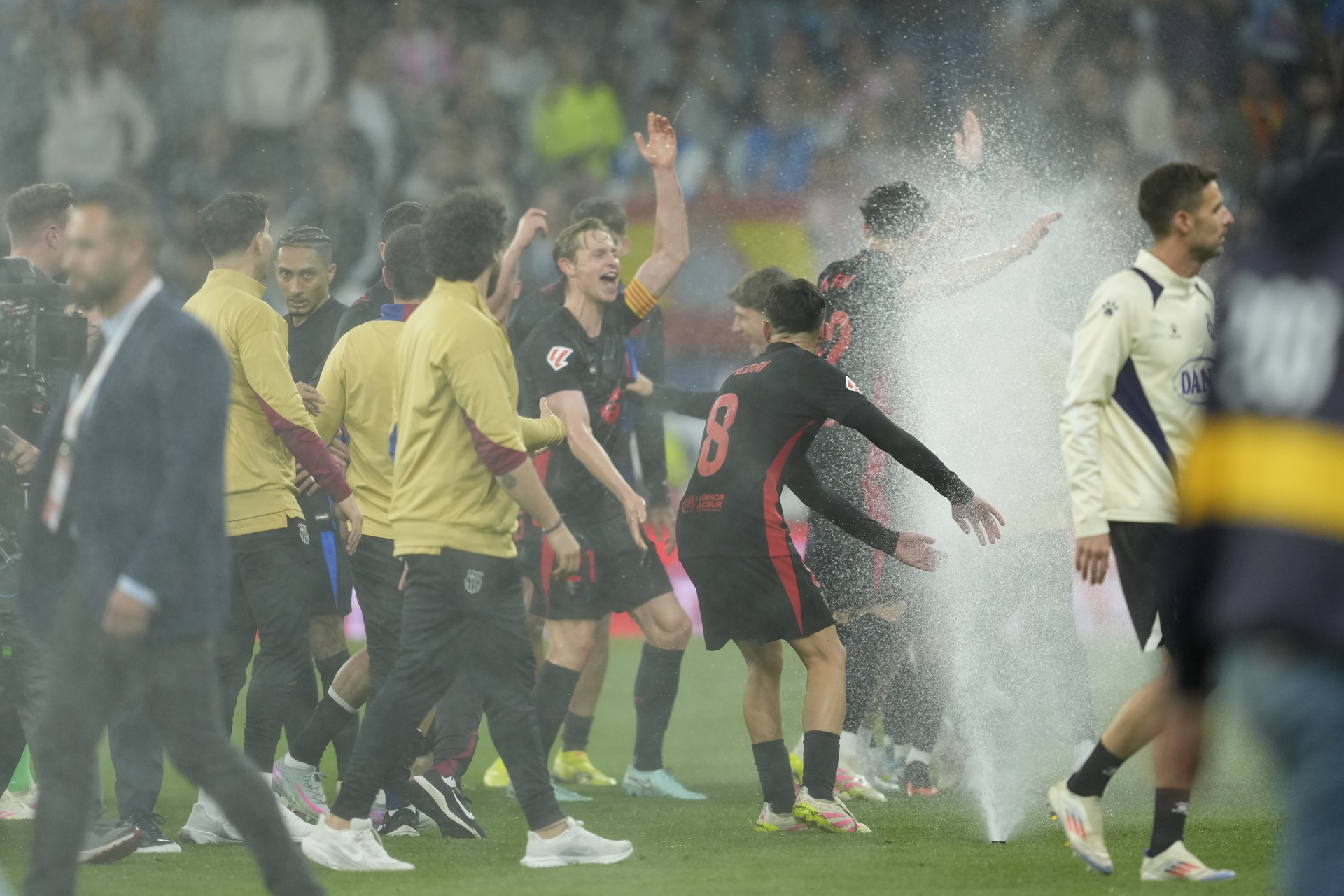 El Espanyol activó los aspersores del césped del RCDE Stadium cuando los jugadores del Barcelona celebraban sobre el terreno de juego la consecución del título de LaLiga tras llevarse el derbi por 0-2.