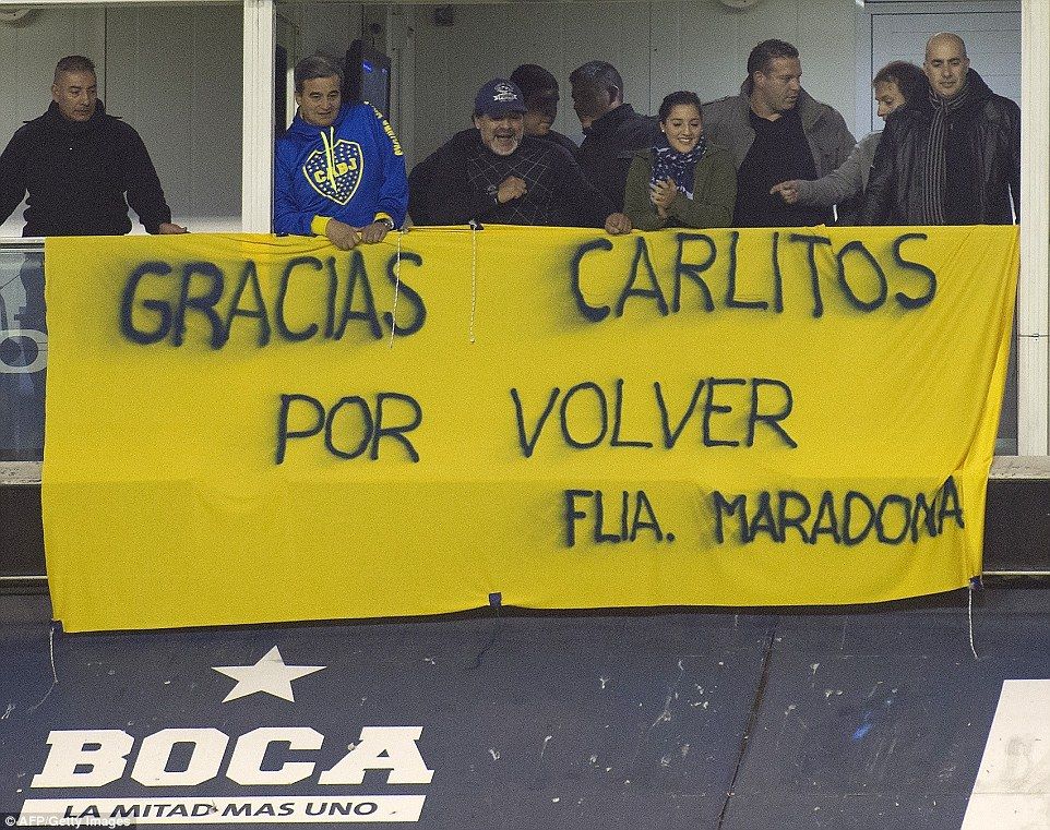 En esta celebración se hizo presente Diego Armando Maradona, que desde su palco lució una manta.