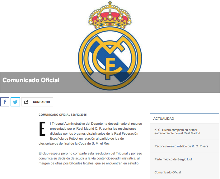 En tanto, el Real Madrid a través de su página de internet publicó una leyenda donde muestra su postura diciendo que “respeta pero no comparte la resolución del TAD (…) por eso comunica su decisión de acudir a la vía contencioso-administrativa al margen de otras posibilidades legales, que se encuentran en estudio”.