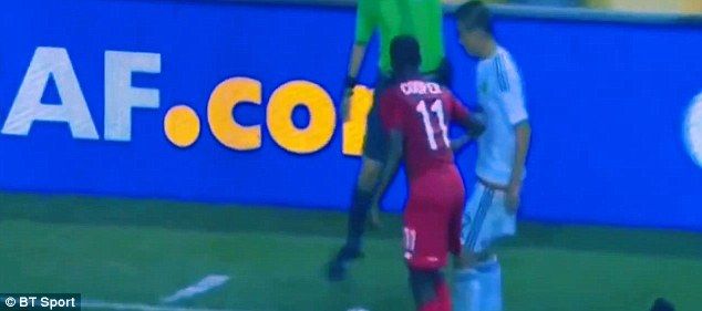 Luego de que Paul Aguilar controlara mal un balón y este se saliera de la cancha, el panameño Armando Cooper se acercó y tocó con su puño el pecho del lateral derecho. El americanista, aprovechando la poca pericia arbitral, fingió, se tiró al piso y gritó como si alguien le hubiera dado una puñalada.