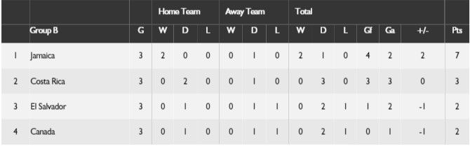 Costa Rica sumó su tercer empate del torneo y esto le alcanzó para avanzar a la siguiente como segundo lugar del Grupo B al registrar tres puntos. Jamaica ocupa el primer lugar con siete unidades. Mientras que El Salvador queda con dos y espera lo que suceda en el Grupo C para ver si se mantiene con vida. Canadá fue eliminado.
