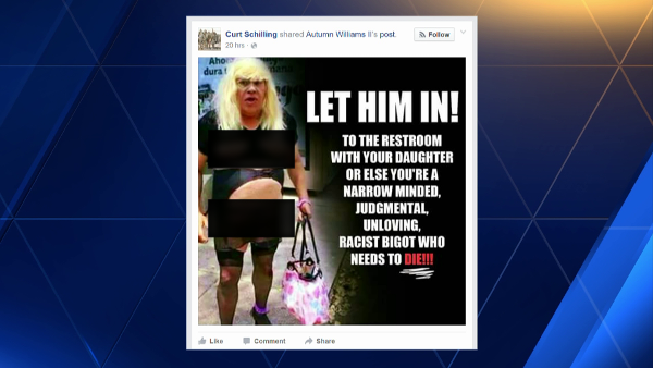 Esta semana, Schilling compartió en la red social la imagen de un hombre obeso que luce una peluca rubia y ropa de mujer en la que aparecía el siguiente comentario: “¡Déjalo entrar al baño con tu hija o alguien más, o serás una persona de mentalidad estrecha, que juzga, que no ama, que es un villano racista y merece morir!”