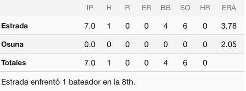 Estrada, que realizó 118 lanzamientos —su mayor cantidad de la temporada— salió del juego ante una gran ovación de los 32 mil 322 asistentes. Estrada (5-3) ganó por cuarta apertura en fila y permitió una carrera en poco más de siete entradas. Dio cuatro pasaportes y ponchó a seis