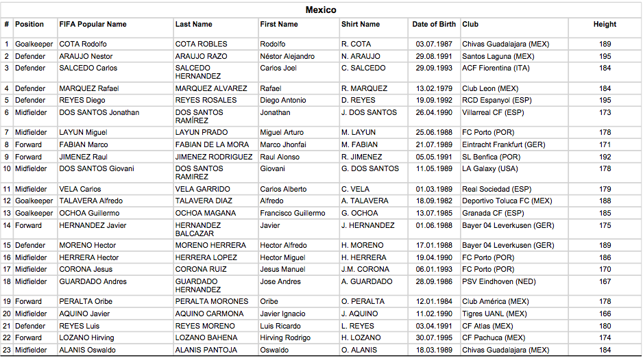 Si bien la Federación Mexicana de Futbol no había dado a conocer de manera oficial el nombre de los 23 jugadores elegidos por Juan Carlos Osorio para disputar la Copa Confederaciones, la FIFA se ha encargado de aclarar la incógnita al publicar la lista registrada por cada selección para afrontar el torneo.