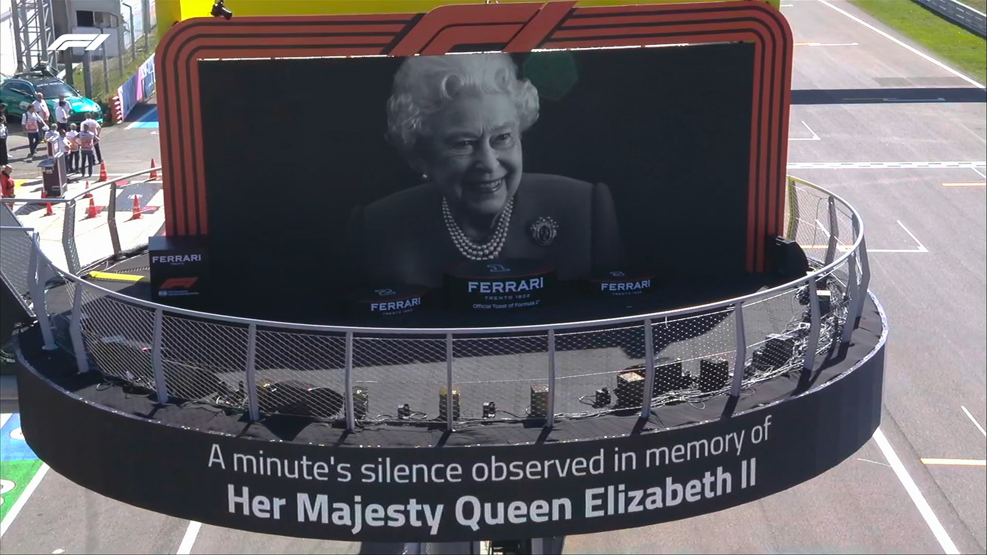 Por segunda vez este fin de semana, la categoría reina del automovilismo homenajeó a Isabel II, en esta ocasión un cuarto de hora antes de la carrera, justo en los instantes previos a que el tenor Andrea Bocelli interpretara el himno de Italia.