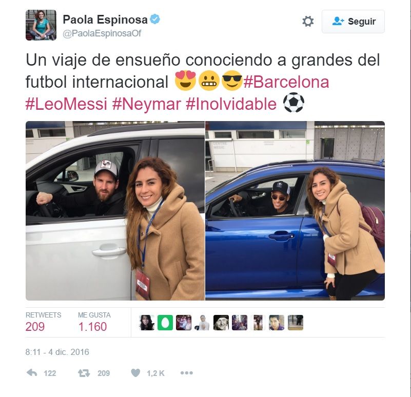 Como parte de dicha visita, encontró a los astros Lionel Messi y Neymar Jr., a lo que aprovechó la oportunidad de fotografiarse con ellos, momento que compartió a través de su cuenta de Twitter.