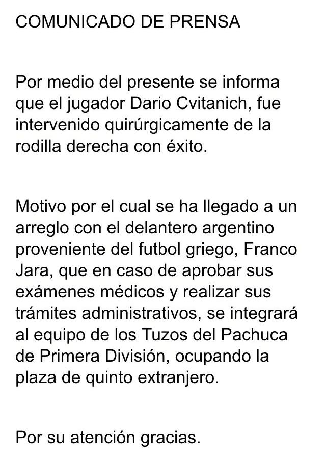 Los Tuzos del Pachuca contrarían al delantero argentino Franco Jara, quien fuera jugador del Olympiacos de Grecia. “En caso de aprobar sus exámenes médicos y realizar sus trámites administrativos, se integrará al equipo de Primera División, ocupando la plaza de quinto extranjero” informó la directiva del club en un comunicado.