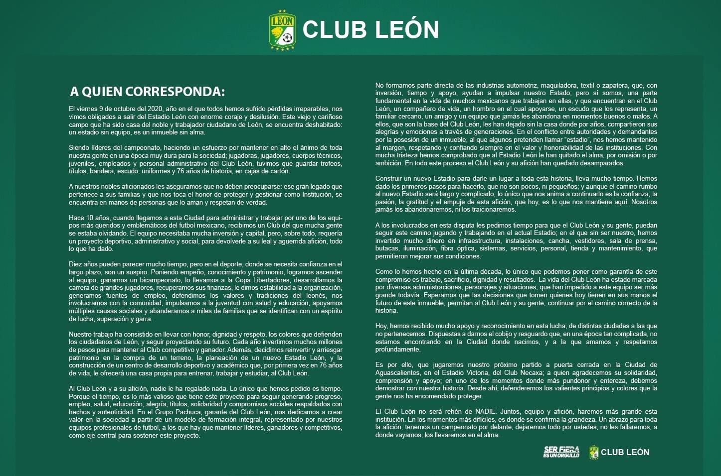 “El viernes 9 de octubre de 2020, año en que todos hemos sufrido pérdidas irreparables, nos vimos obligados a salir del Estadio León con enorme coraje y desilusión. Este viejo y cariñoso campo que ha sido casa del noble y trabajador ciudadano del León, se encuentra deshabitado: un estadio sin equipo es un inmueble sin alma”, precisó en el comunicado.