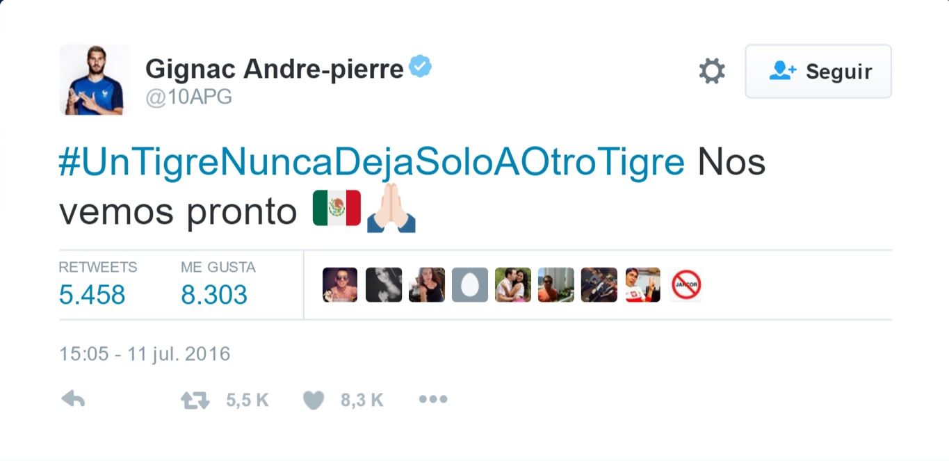 Ante esos rumores, el galo tuiteó en respuesta que “#UnTigreNuncaDejaSoloAOtroTigre Nos vemos pronto”, con la bandera de México acompañado de un emoji.