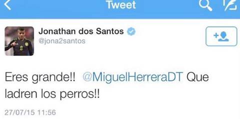 Los futbolistas mexicanos Giovani y Jonathan Dos Santos felicitaron a su técnico Miguel Herrera por agredir al periodista Christian Martinoli.