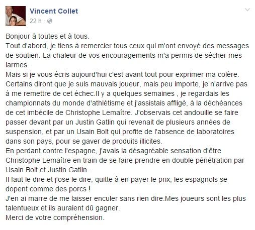 “A todos mis amigos de Facebook y los de Vincent: su cuenta ha sido hackeada por un gran cab… que acaba de publicar un comentario haciéndose pasar por él. Acabo de hablar con Vincent por teléfono. Por supuesto, no ha sido él quien ha escrito esas difamaciones sobre Christophe Lemaitre y los españoles. Sobre todo, no le den like ni lo compartan”, explicó Guivarch en Facebook.