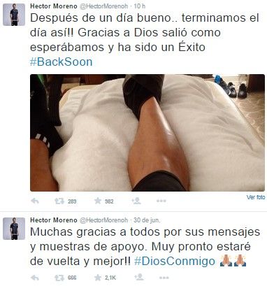 En redes sociales, Héctor Moreno escribió que: “Gracias a Dios salió como esperábamos y ha sido un éxito. Gracias a todos por los mensajes y muestras de apoyo. Muy pronto estaré de vuelta y mejor”.