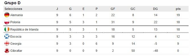Con el triunfo, Irlanda alcanzó 18 puntos y llegó a la segunda posición, alcanzando a Polonia pero estos últimos mejor posicionados por diferencia de goles. Mientras que Alemania se queda en el primer lugar del grupo con 19 unidades. Sin embargo, será hasta el domingo 11 de octubre cuando se definan los equipos clasificados a la Eurocopa con los partidos Alemania-Georgia y Polonia-Irlanda, este último por el pase directo al torneo francés.