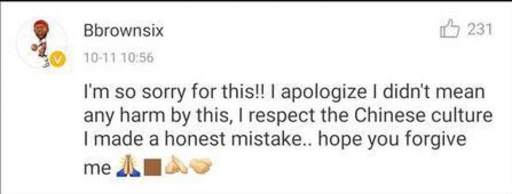 Luego de miles de reacciones en su contra, al jugador no le quedó otro remedio más que borrar la foto y el mensaje de la red social, además Brown ofreció disculpas: “Yo respeto la cultura china y he cometido un error sin mala intención. Espero que me perdonen”.