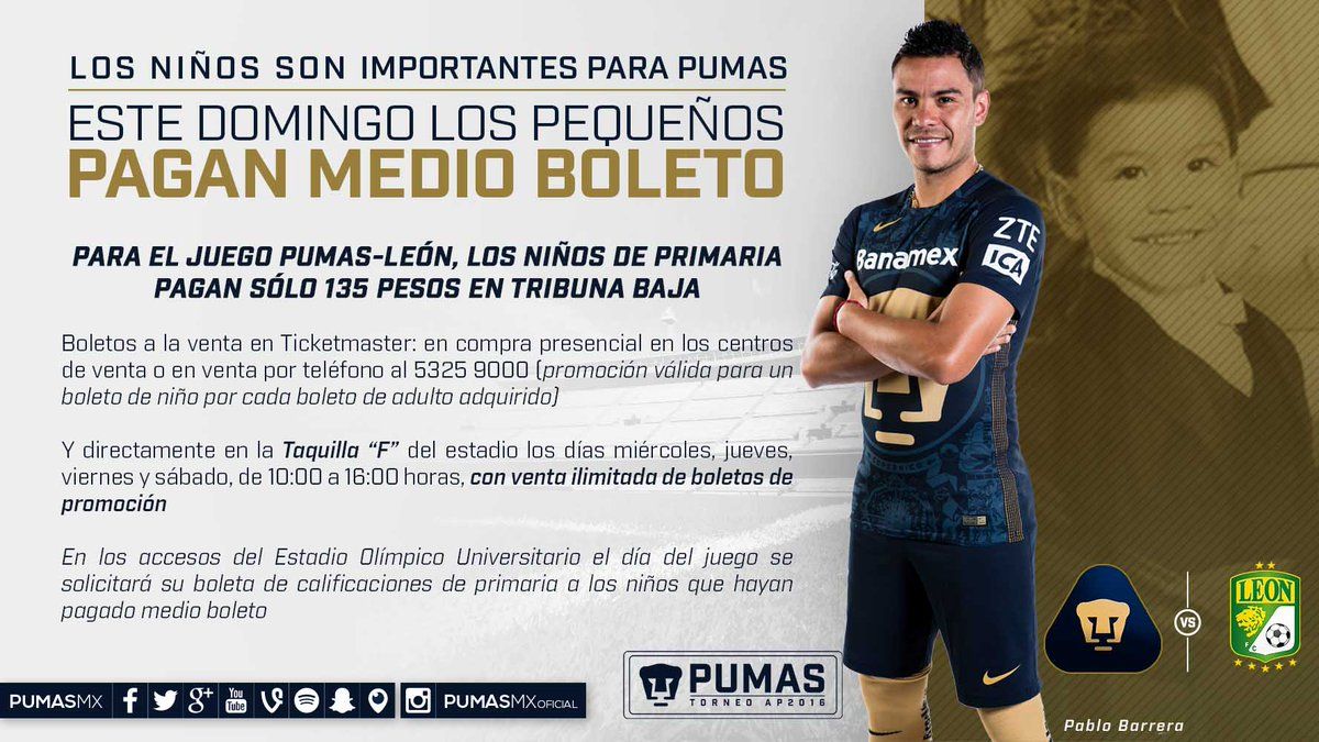 El día de hoy, los Pumas revelaron un promocional con el cual invita a la afición a que lleven a los niños al Estadio Universitario en su próximo juego como local cuando reciban al León en el marco de la Jornada 3 del Torneo Apertura 2016, pues ellos podrán ingresar con boleto a mitad de precio.