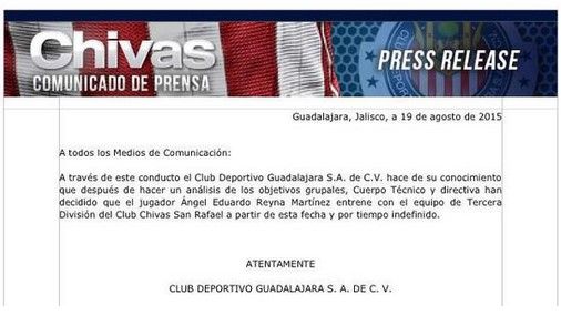 “A través de este conducto el Club Deportivo Guadalajara S.A. de C.V. hace de su conocimiento que después de hacer un análisis de los objetivos grupales, Cuerpo Técnico y directiva han decidido que el jugador Ángel Eduardo Reyna Martínez entrene con el equipo de Tercera División del Club Chivas San Rafael a partir de esta fecha y por tiempo indefinido”, señala.