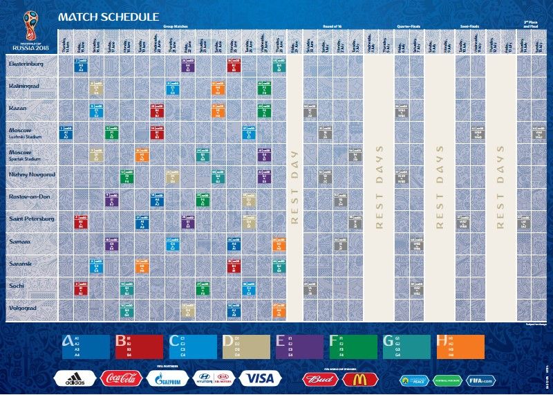 La FIFA confirmó el día de hoy el calendario para el Mundial 2018 que se jugará en Rusia. Cada una de las 12 sedes albergará cuatro partidos de la fase de grupos.