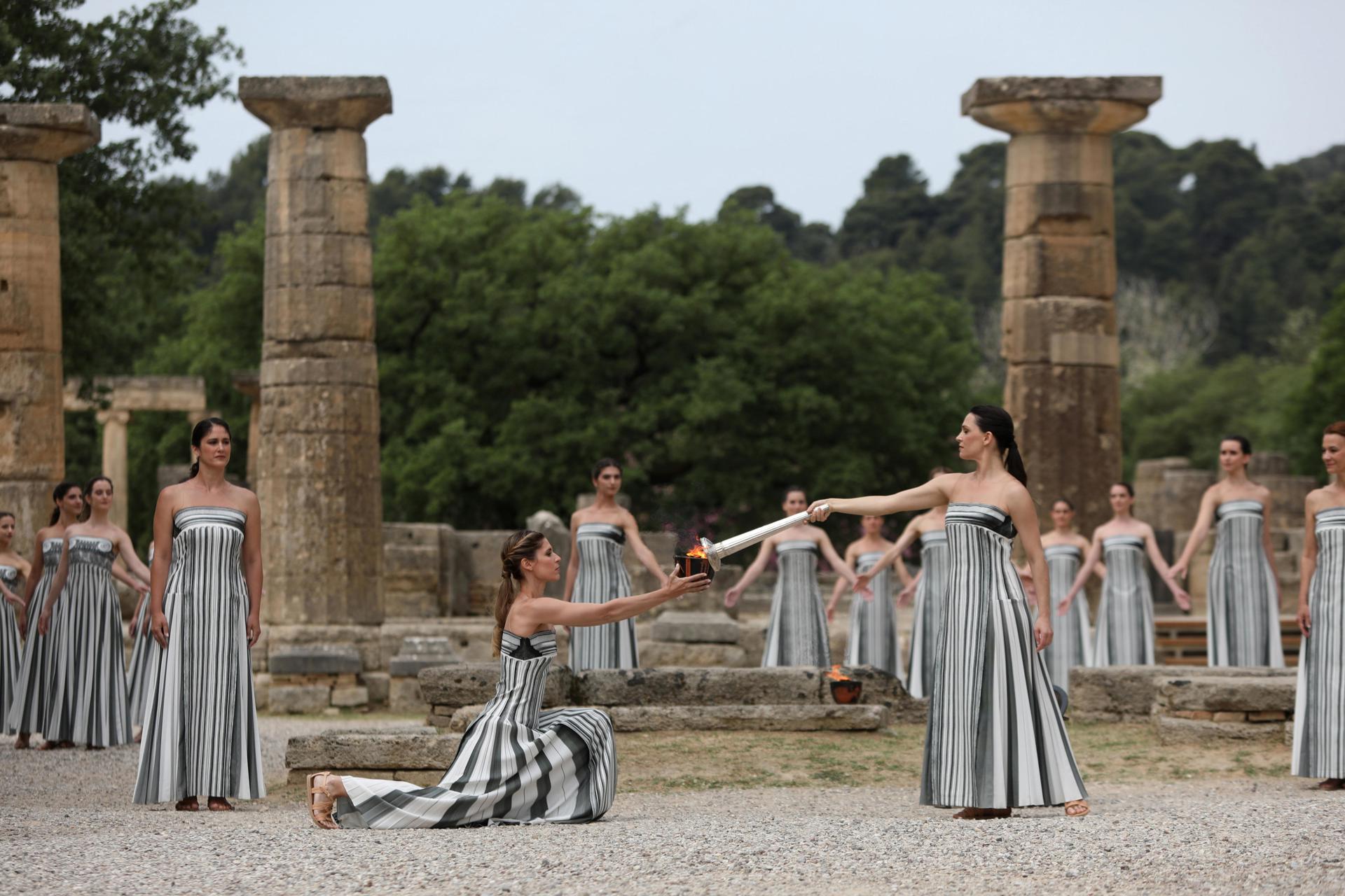 El encendido de la llama olímpica se celebró este martes en las ruinas de la antigua Olimpia, en una ceremonia tradicional en la que se invocó al dios Apolo y se entregó la llama al primer portador, que comienza su recorrido hacia París para los juegos de este verano.