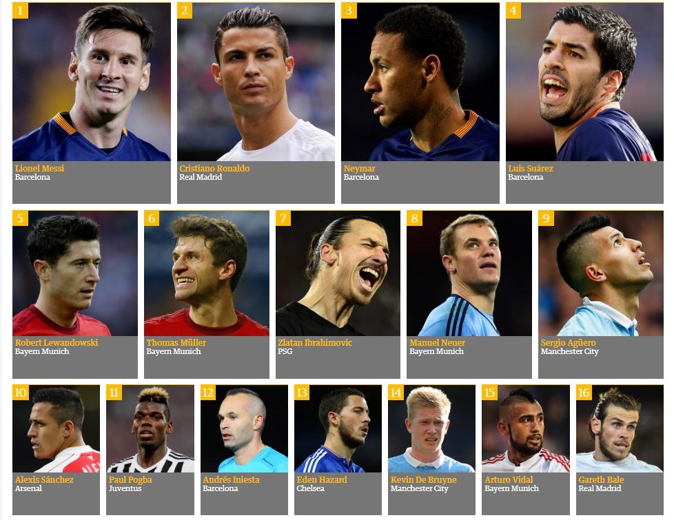 El prestigiado periódico inglés The Guardian realizó una encuesta entre exfutbolistas, entrenadores y medios para conocer quiénes son los 100 mejores jugadores del mundo.