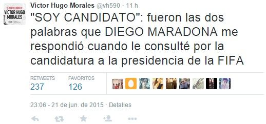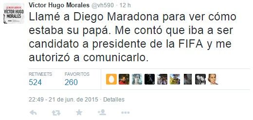 “Llamé a Diego Maradona para ver cómo estaba su papá. Me contó que iba a ser candidato a presidente de la FIFA y me autorizó a comunicarlo”, señaló Víctor Hugo Morales en su cuenta de Twitter.