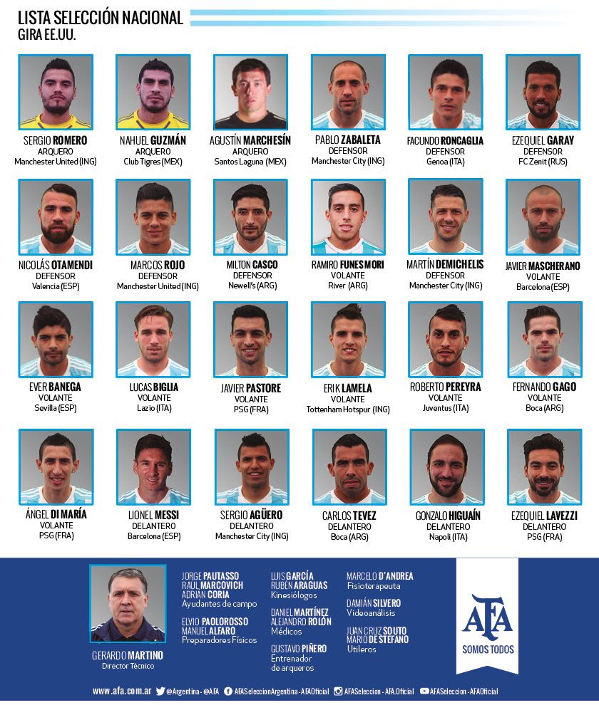Además de Messi, el entrenador Gerardo Martino llamó a Ángel Di María, Ezequiel Lavezzi, Carlos Tevez, Sergio Agüero, Gonzalo Higuaín, Javier Mascherano, Sergio Romero y Ever Banega, entre otros.