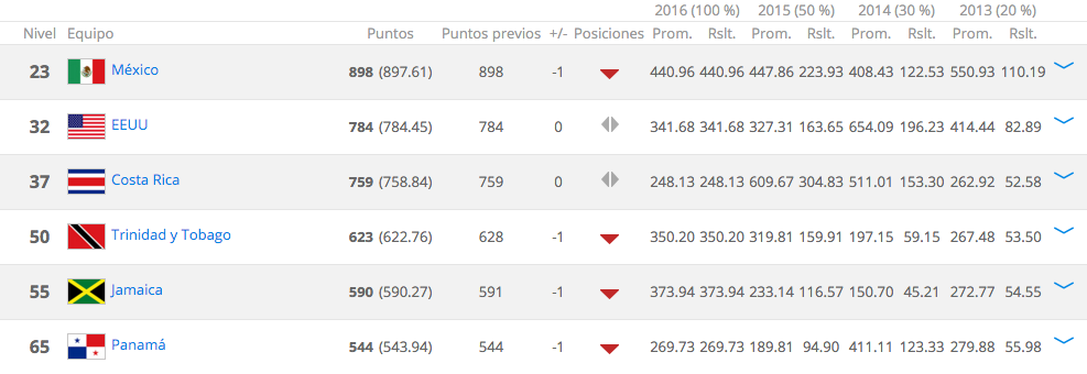Con 898 puntos, México, que en diciembre era el lugar 22 y ahora es el 23, se mantiene en el primer puesto de la zona de CONCACAF, seguido de Estados Unidos con 784 unidades y Costa Rica con 759, todos sin cambios.