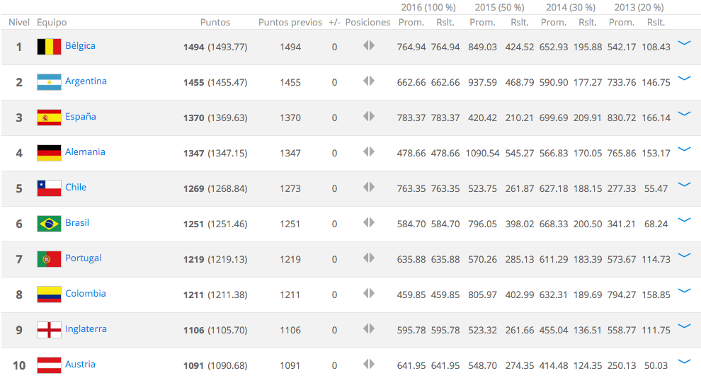 En el primer listado de las selecciones nacionales en el 2016, el Top 10 de la clasificación se mantuvo sin cambios, con Argentina y España acompañando a los Diablos Rojos en el podio.