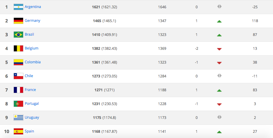 Francia, los subcampeones de la pasada Eurocopa escalaron un lugar, mientras que Portugal, el equipo que ganó dicha competencia, bajó un puesto para ubicarse en octavo. Uruguay y España completan los primeros 10 lugares.