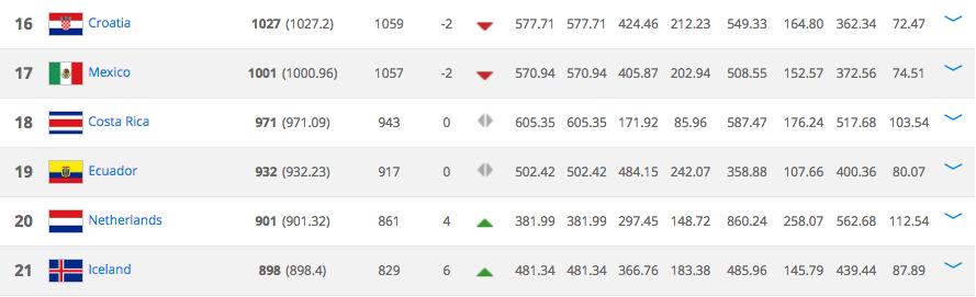 El cuarto lugar le pertenece a Bélgica que cayó dos puestos, Colombia en quinto que también perdió un lugar. Chile se mantuvo en el sexto lugar.