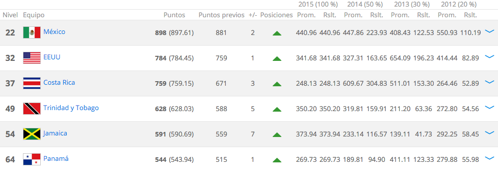 Con 898 puntos, México, que en noviembre era el lugar 24 y ahora es el 22, se ubica en el primer lugar de la zona de la CONCACAF, seguido de Estados Unidos con 784 unidades y Costa Rica con 759.