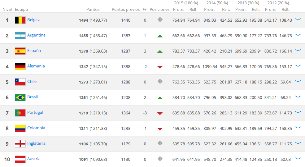 Además, Brasil, Portugal y Colombia, se ubicaron en los sitios seis, siete y ocho respectivamente, mientras que Inglaterra y Austria completan el Top 10 en la última clasificación del 2015.