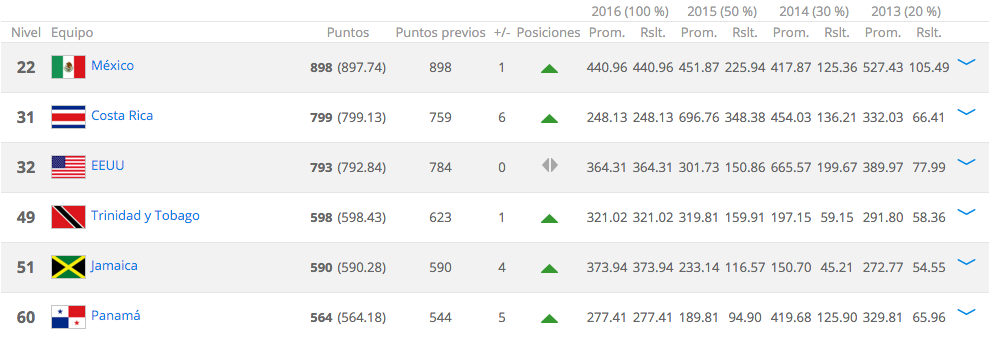Con 898 puntos, México, que en enero era el lugar 23 y ahora es el 22, se mantiene en el primer puesto de la zona de CONCACAF, seguido de Costa Rica con 799 unidades, que superó a Estados Unidos, que es el tercero mejor de la confederación con 793 puntos.