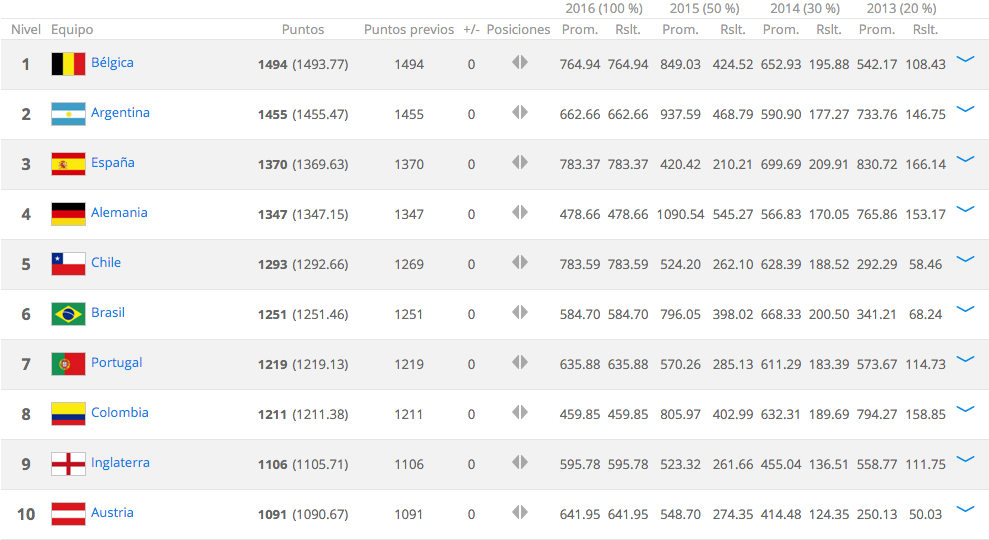 El campeón mundial Alemania está cuarto, seguido por Chile y Brasil. Las 10 primeras selecciones son todos europeas y sudamericanas.