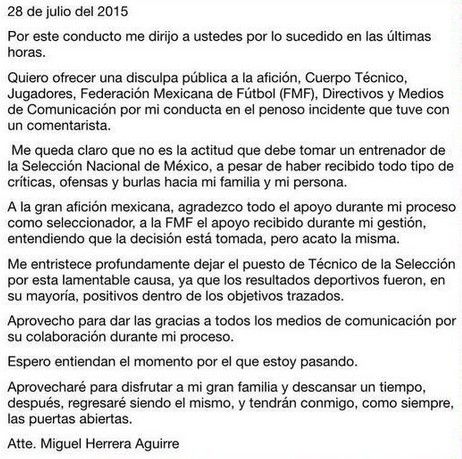 Miguel Herrera ofrece disculpas - comunicado-piojo