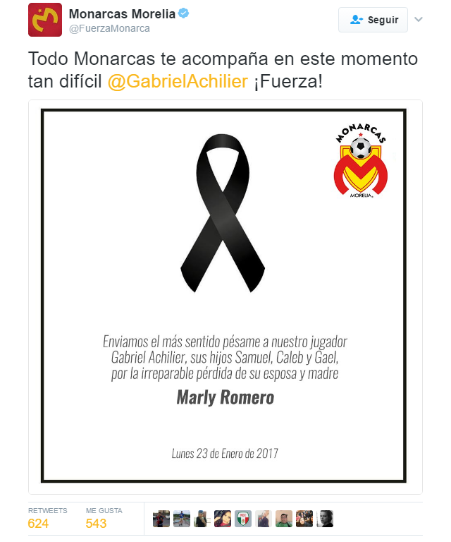 El equipo, a través de su cuenta de Twitter, informó que “Todo Monarcas te acompaña en este momento tan difícil @GabrielAchilier ¡Fuerza!”, acompañando una esquela firmada por el club.