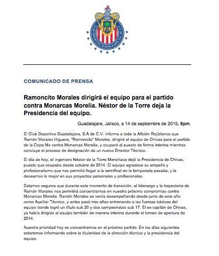 Néstor de la Torre, quien fungía como presidente del equipo, queda fuera de Chivas del Guadalajara, así lo informó el club en un comunicado: “El día de hoy, el ingeniero Néstor de la Torre Menchaca dejó la Presidencia de Chivas, puesto que ocupaba desde octubre de 2014. El equipo agradece su empeño y profesionalismo que nos permitió llegar a la semifinal en la temporada pasada, y le deseamos lo mejor en sus proyectos personales y profesionales”.