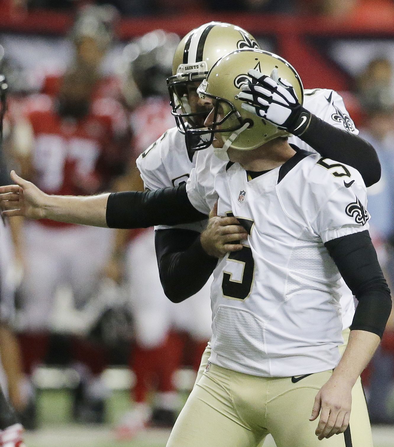Thomas Morstead, pateador de despeje de los Saints de Nueva Orleáns, abraza a su compañero Kai Forbath, quien convirtió un gol de campo para vencer a los Falcons de Nueva Orleáns, el domingo 3 de enero de 2016 (AP Foto/David Goldman)