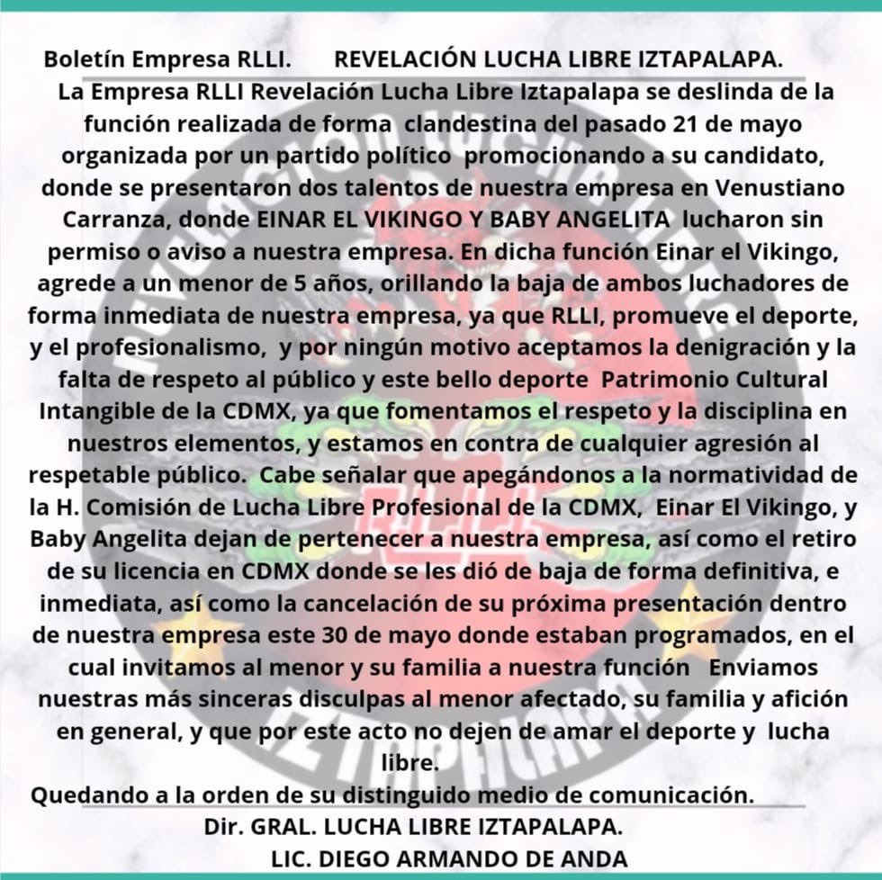Por su parte, Revelación Lucha Libre Iztapalapa (RLLI) detalló que la función de lucha libre realizada en la colonia Aviación Civil de la Venustiano Carranza se llevó a cabo sin permiso o aviso a la compañía.