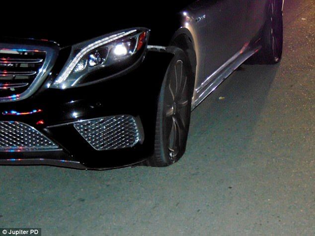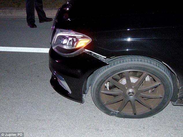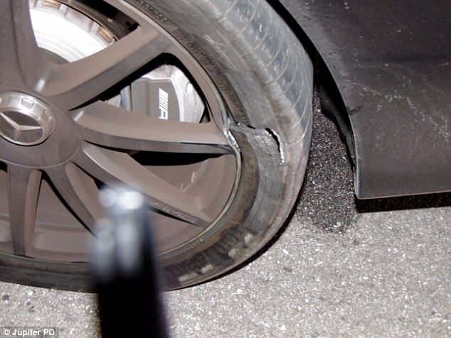 La policía también difundió fotografías del Mercedes del golfista, donde se aprecian las llantas ponchadas así como parte del daño a la carrocería.