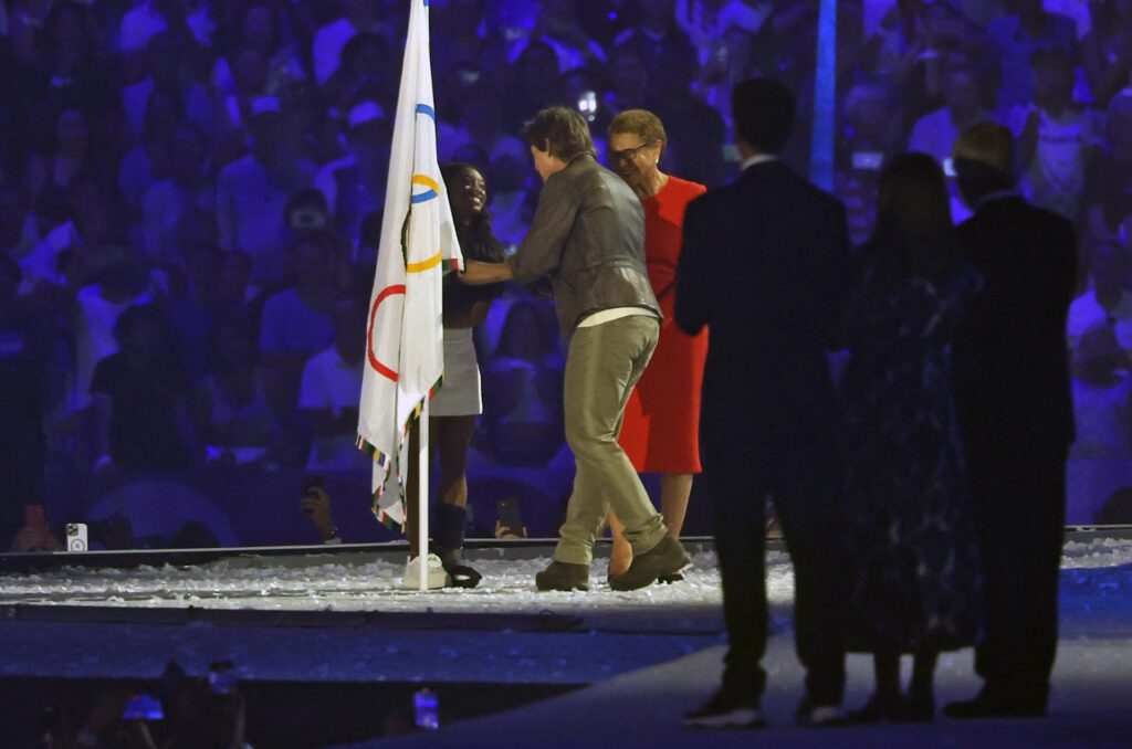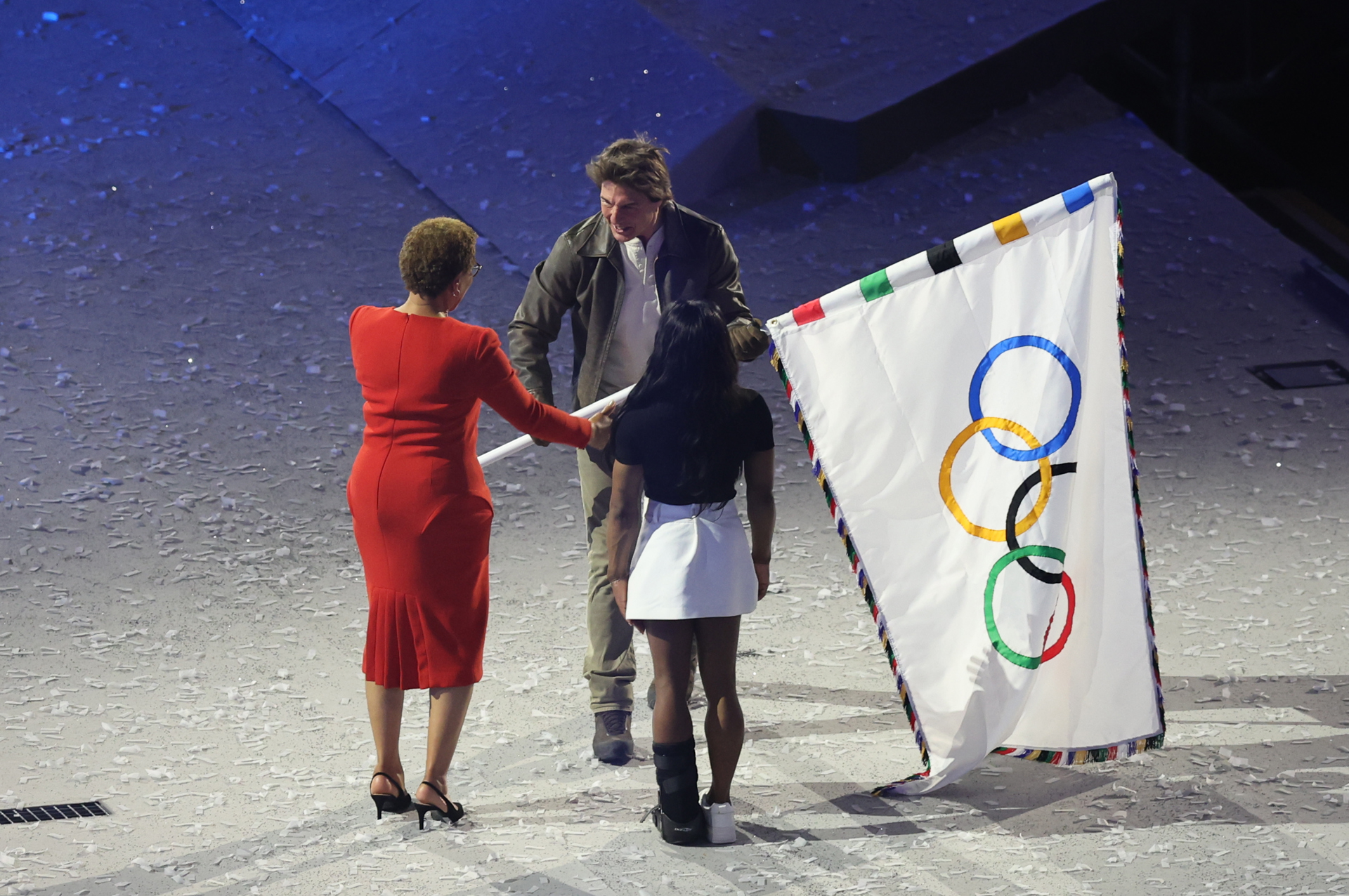 La primera edil parisina, Anne Hidalgo, entregó primero la enseña olímpica a Thomas Bach y éste se la cedió a Bass, quien junto a la gimnasta olímpica estadounidense Simone Biles ondearon la bandera entre los aplausos y ovaciones de los más de 71 mil asistentes a la ceremonia de clausura en el Estadio de Francia, que cierra así el ciclo olímpico de París.