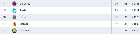 En cuanto al tema del descenso, Puebla llega a 91 puntos en 79 juegos para un cociente de 1.1519 que lo pone en el lugar 15.