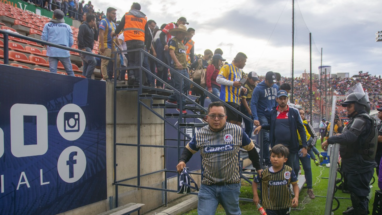 Durante el duelo entre Atlético de San Luis y Querétaro se dieron incidentes de violencia que obligaron a la gente de seguridad a reubicar a los aficionados, a quienes tuvieron que bajar a la cancha para lograr el movimiento.