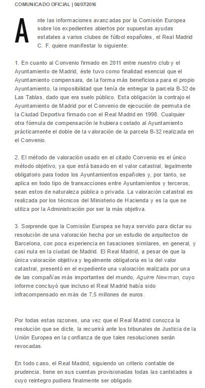 El punto 3 del comunicado, no obstante, es lo que más ha causado polémica: “sorprende que la Comisión Europea se haya servido para dictar su resolución de una valoración hecha por un estudio de arquitectos de Barcelona, con poca experiencia en tasaciones similares, en general, y casi nula en la ciudad de Madrid. El Real Madrid, a pesar de que la única valoración objetiva y legalmente obligatoria es la del valor catastral, presentó en el expediente una valoración realizada por una de las compañías más importantes del mundo, Aguirre Newman, cuyo informe concluyó que incluso el Real Madrid había sido infracompensado en más de 7,5 millones de euros”.