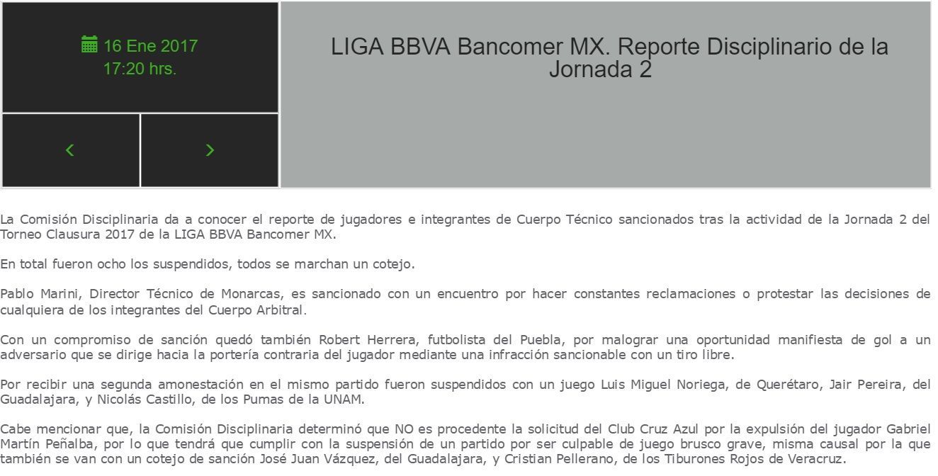 En tanto que el defensa uruguayo de Puebla, Robert Herrera, fue castigado un encuentro “por malograr una oportunidad manifiesta de gol a un adversario que se dirige hacia la portería contraria del jugador mediante una infracción sancionable con un tiro libre”.