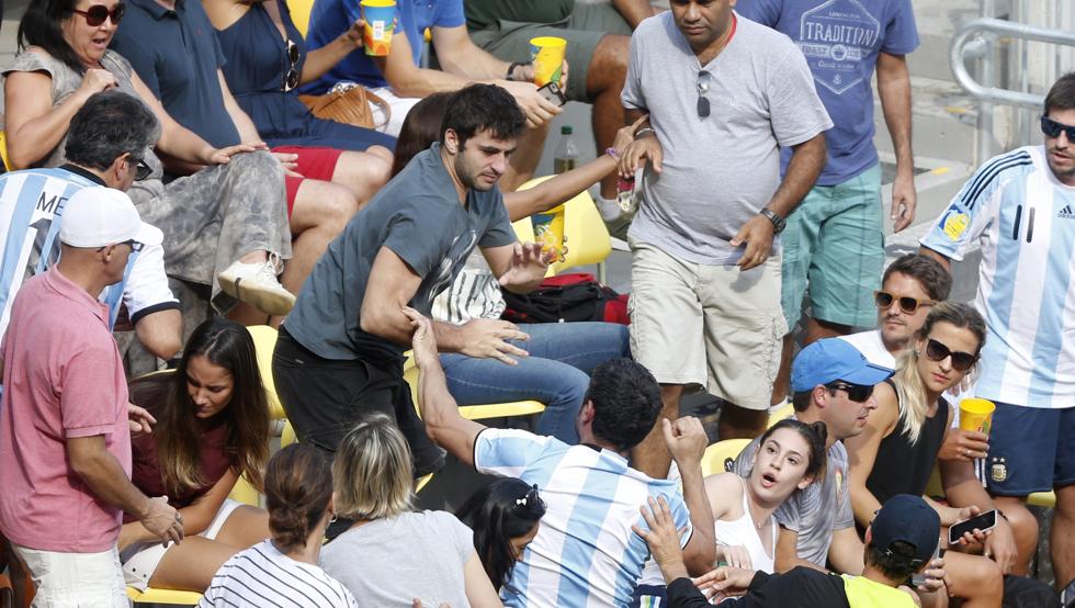 Las cámaras de la transmisión oficial no lo mostraron, pero los comentaristas explicaron que un fanático brasileño y uno argentino se liaron a golpes, armando un gran revuelo. No fue hasta que personal de seguridad separara a los hombres que el juego pudo reanudarse. Las imágenes de la trifulca aparecieron minutos más tarde en las redes sociales.