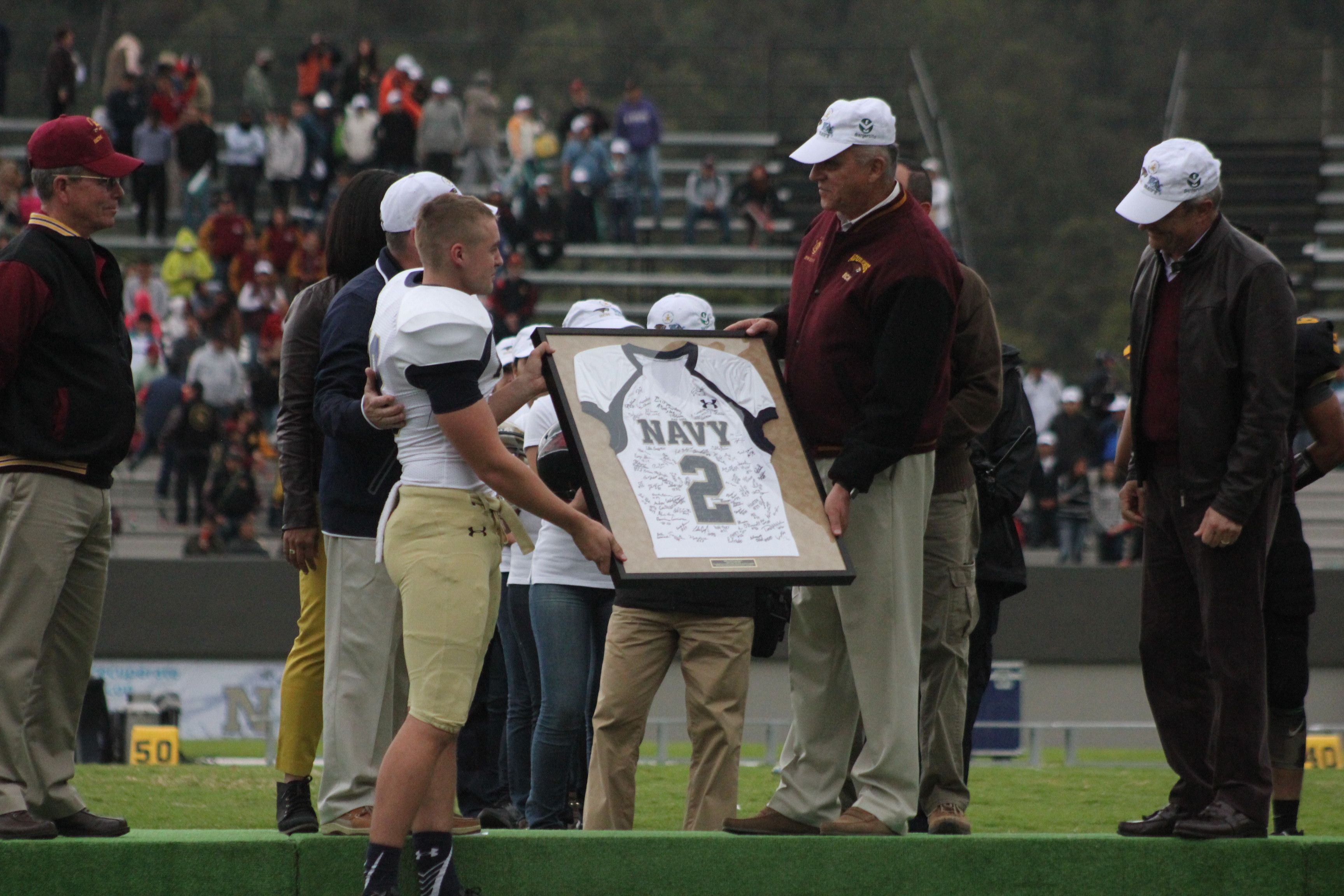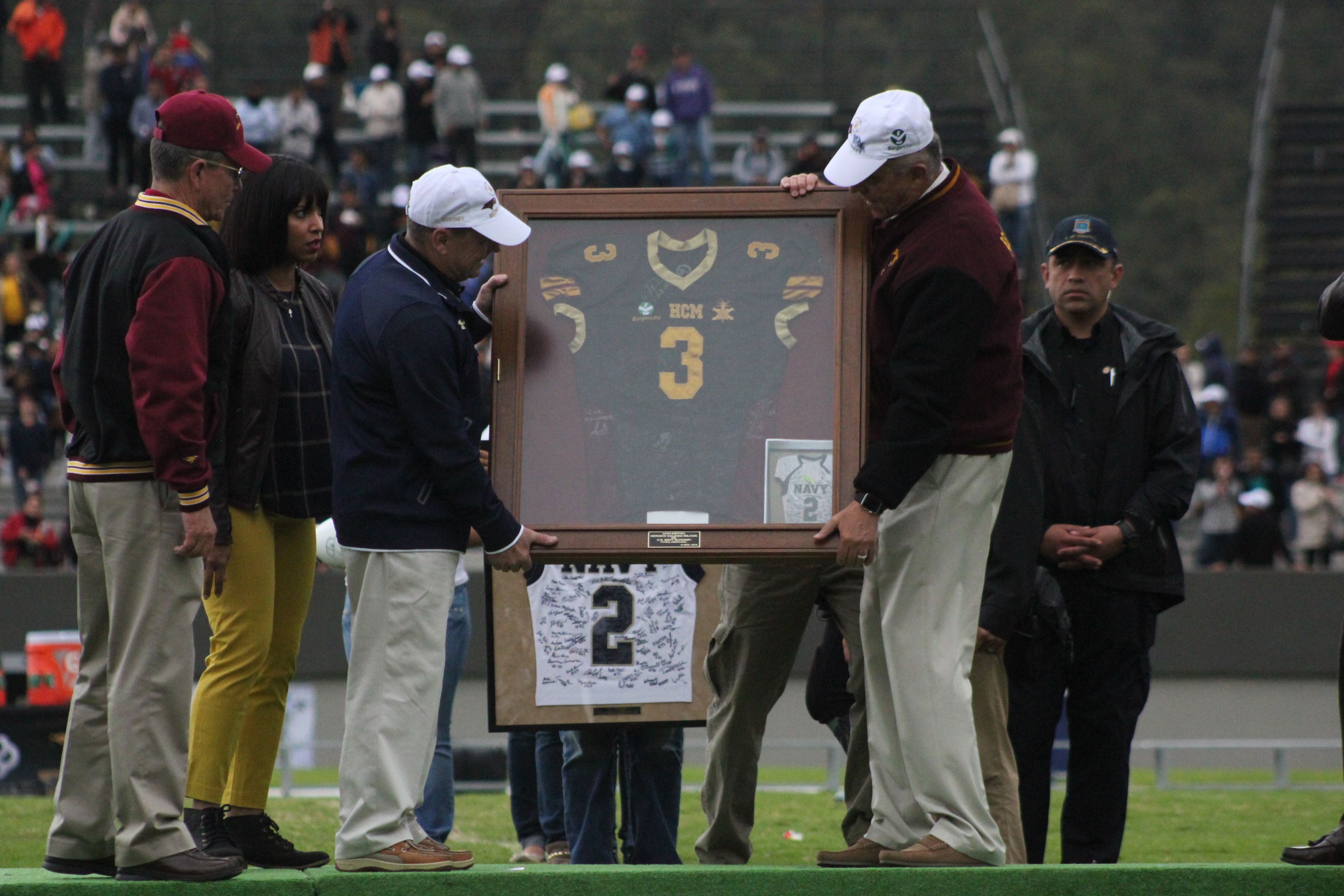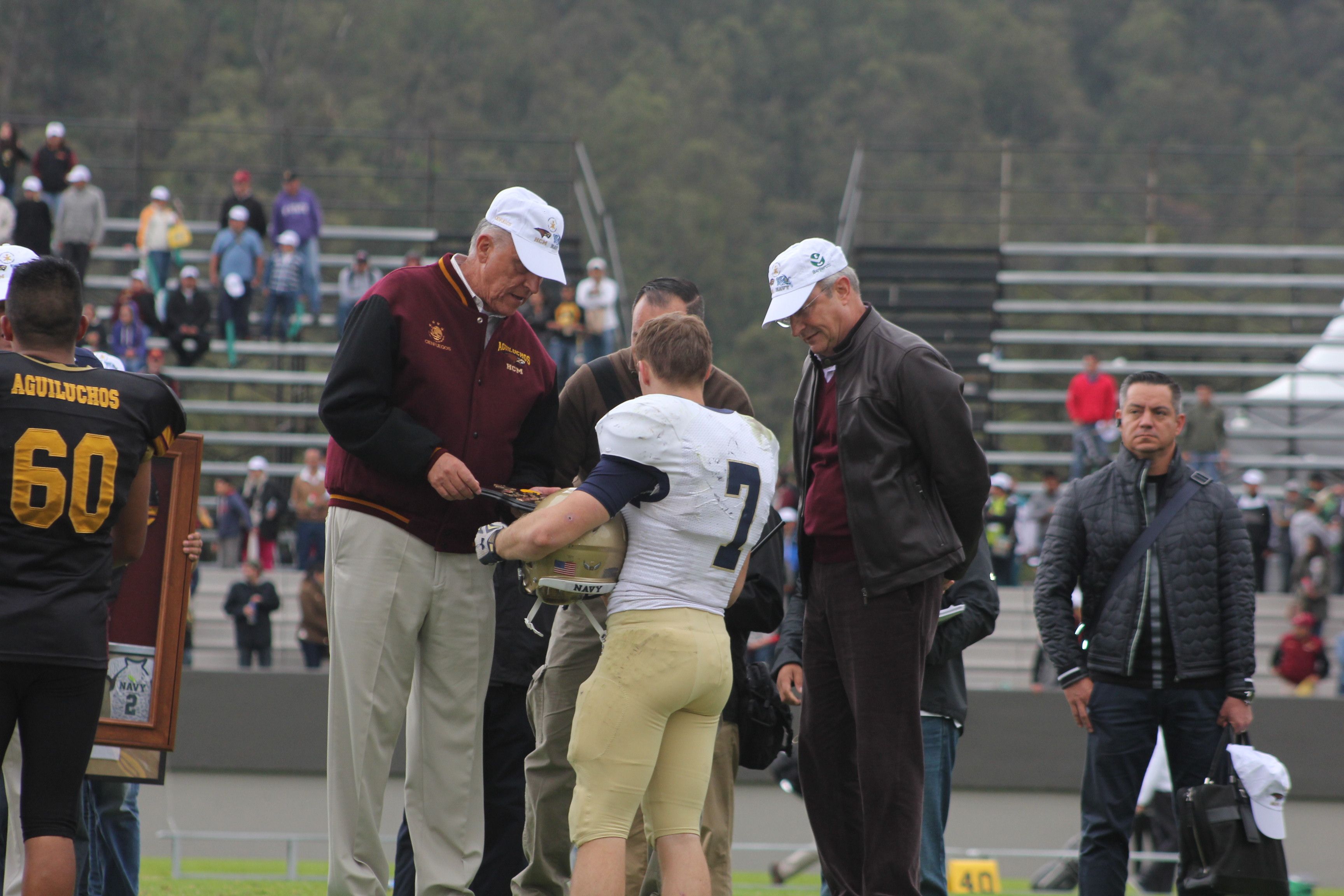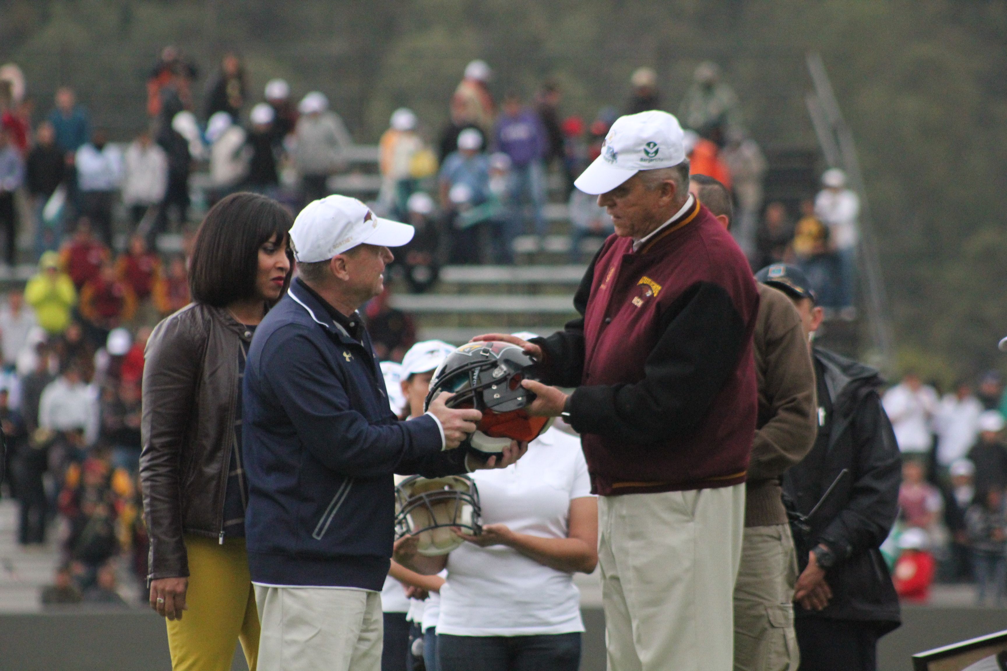 Al finalizar el evento los equipos realizaron intercambio de un casco y jersey representativos de cada escuadra, así como un balón firmado por el General Salvador Cienfuegos Zepeda y el Almirante William E. Gortney.