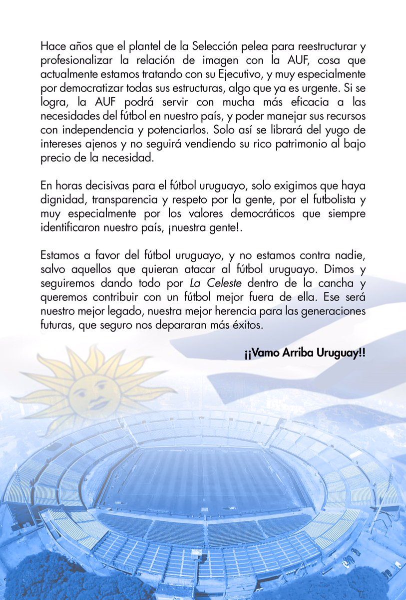 Estamos a favor del fútbol uruguayo, y no estamos contra nadie, salvo aquellos que quieran atacar al fútbol uruguayo. Dimos y seguiremos dando todo por La Celeste dentro de la cancha y queremos contribuir con un fútbol mejor fuera de ella. Ese será nuestro mejor legado, nuestra mejor herencia para las generaciones futuras, que seguro nos deparan más éxitos.