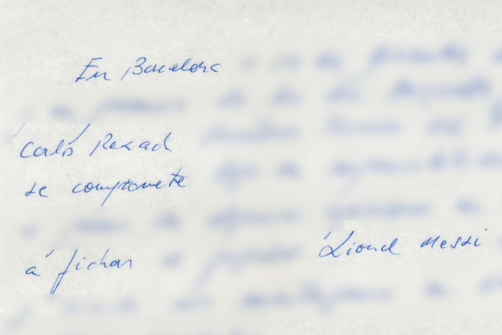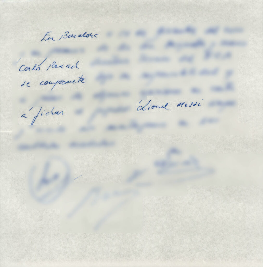 En Barcelona, a 14 de diciembre del 2000 y en presencia de los Srs. Minguella y Horacio, Carles Rexach, secretario técnico del FC Barcelona, se compromete bajo su responsabilidad y a pesar de algunas opiniones en contra a fichar al jugador Lionel Messi siempre y cuando nos mantengamos en las cantidades acordadas”, decía la servilleta.