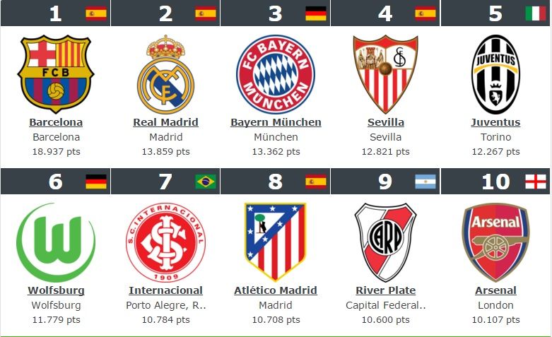 Barcelona, Real Madrid, Bayern München, Sevilla y Juventus encabezan la clasificación.